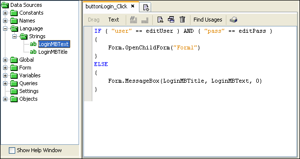 The language text values can be classified into two categories : Design time literals and runtime literals. The design time literals refer to the text values that are displayed by the controls such as buttons, check boxes etc. Runtime literals refer to the text values that are displayed and managed by the expressions, such as a message box displaying a user message. BrightBuilder allows the definition and east manipulation of these two types of text values.