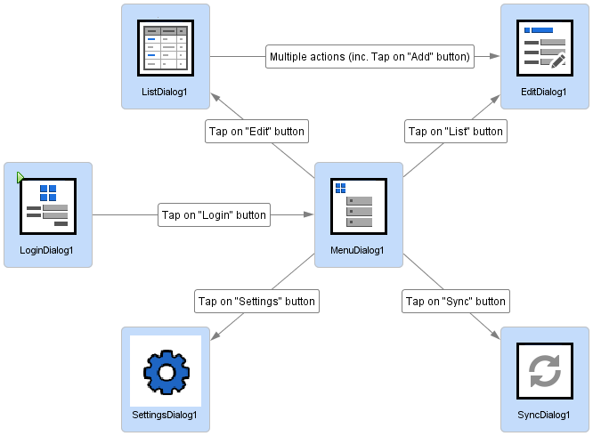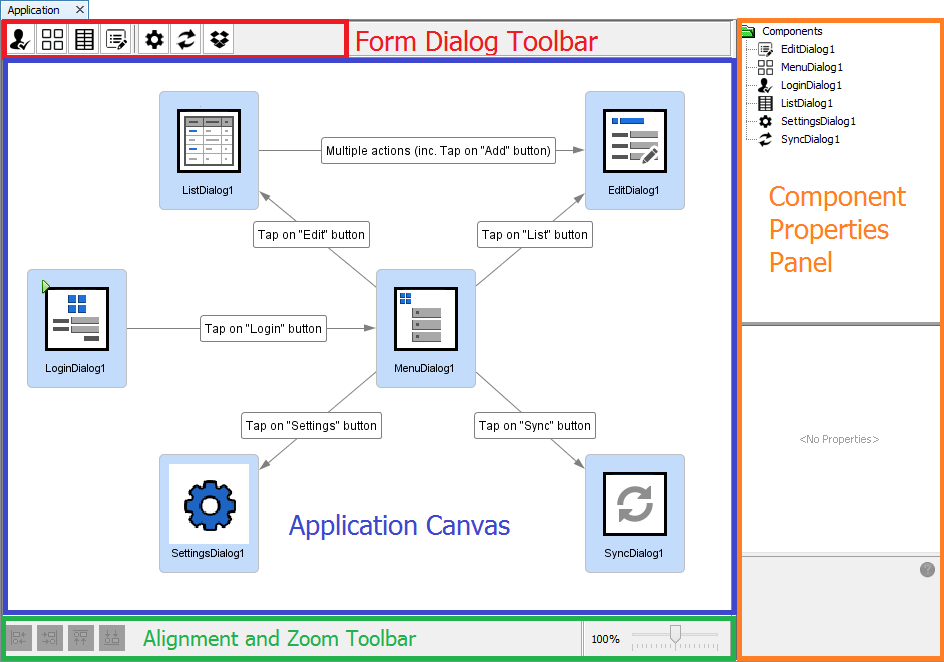 Simply dragging and dropping a form dialog icon onto the Application Canvas will create a dialog component of that specific dialog (e.g. dragging and dropping the settings icon will create a settings dialog component). These components are visual representations of form dialogs and may be the target of form links. Once created, double-clicking on a dialog component in the Application Canvas will open the specific dialog editor where the properties of the dialog can be changed.