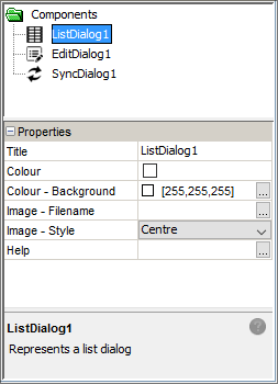 The Component Properties Panel is a section of the Application Panel used to display a list of form dialogs currently defined within the application. This panel is also used to display the properties available to each form dialog node. Through the Component Properties Panel, these properties can be altered to tailor to the developers needs. The title of the form that is displayed in the application can be changed as well as other display features such as background colour and image style.