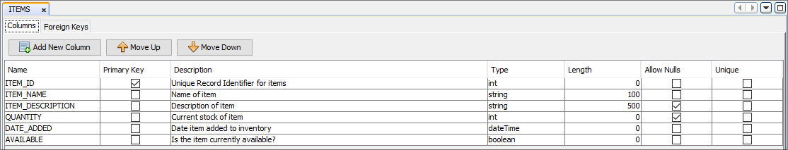 Caution should be taken when modifying an existing table definition when in use elsewhere in the project (such as in form dialogs in the Application element), as editing these definitions can cause errors within the project that will need to be rectified and fixed before publishing of the application.