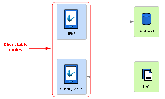 Client table nodes are sync points that represent the tables in the mobile application when executed on the devices out in the field. These nodes essentially represent the data of that client table on devices. These nodes can then be linked to data accessors in order to send and/or receive data.