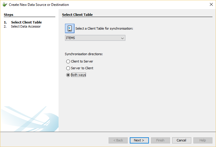 Once the wizard is opened, the first step is to select the client table to be used in the Data Flow Link. A drop list can be used to select the client table out of the already defined tables in the project. The direction where data will flow will also need to be defined indicating which sync point will receive and/or send data will also need to be specified. The direction of the synchronisation can be either 'Client to Server', 'Server to Client' or 'Both ways'.