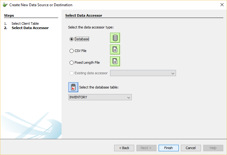 By selecting the required type, more specific options will need to be set such as the table within the database to be used. These other options will automatically appear within the wizard and will need to be given valid values before the creation of the Data Flow Link.