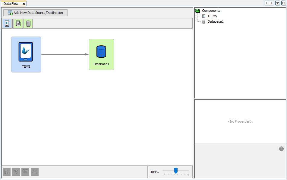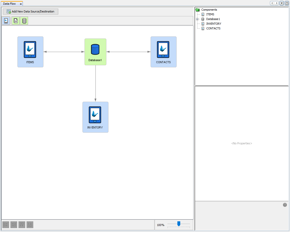 By double-clicking the Data Flow element under the BXP project tree, the Data Flow Panel will appear. The Data Flow Panel is used to display a visual view of data flow between client mobile device tables and server side data sources. Through the Data Flow Panel, the flow of data can be defined graphically between sync points. Sync points are data sources in which data can be sent and/or received. Sync points can be client tables on devices and/or back-end data sources on the server such as server tables in a database and/or files. Hence if the developed application requires data communication between client devices and server side systems, the data flow must be defined accordingly to allow for this exchange of data within the process of synchronisation to take place correctly. Additionally, if the BXP project requires the use of synchronisation, the project and its associated Data Flow element should be deployed onto a BrightServer instance. When the device running the BXP application connects to BrightServer to synchronise, logic defined in the Data Flow panel will then be used accordingly.