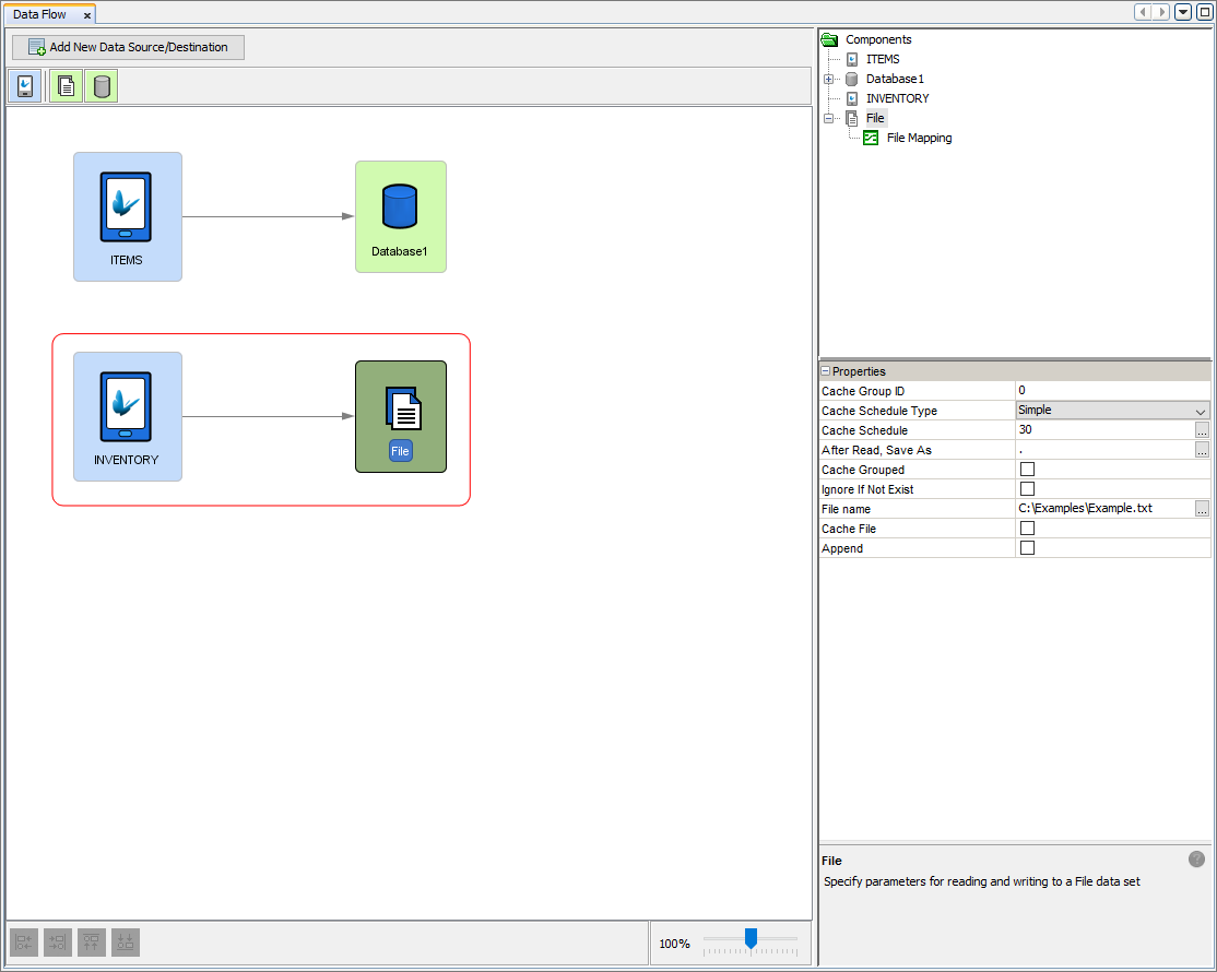 By clicking on the file data accessor node, the properties of the file accessor will populate the properties panel in the Data Flow Panel. Here the details of the file can be specified. The file itself is defined by the 'File name' property. The file name property specified in the file to be used in the synchronisation so proper permissions should be set to allow the server read and write access to the file. Further properties can be managed such as the 'Append' property. When this property is ticked, new data to be written to the file will be added to the end of the specified file, otherwise if unticked, the existing contents of the file will be overwritten with the new server data received. Another useful property is the 'Ignore If Not Exist' where left unticked and the file is set to be read but does not exist then an error is produced on the server. However if it is ticked, then the fact the file does not exist is ignored and no error is thrown.