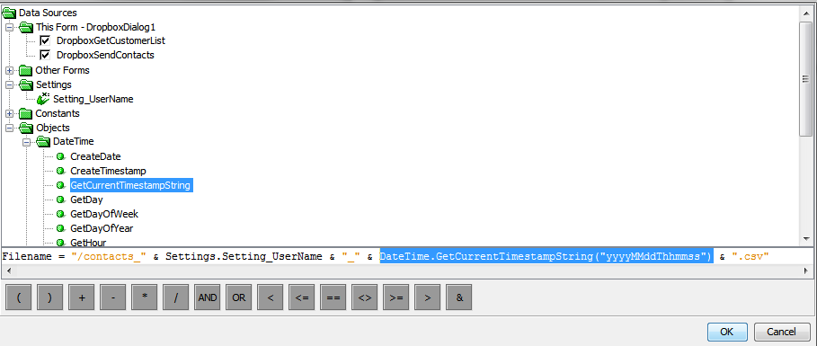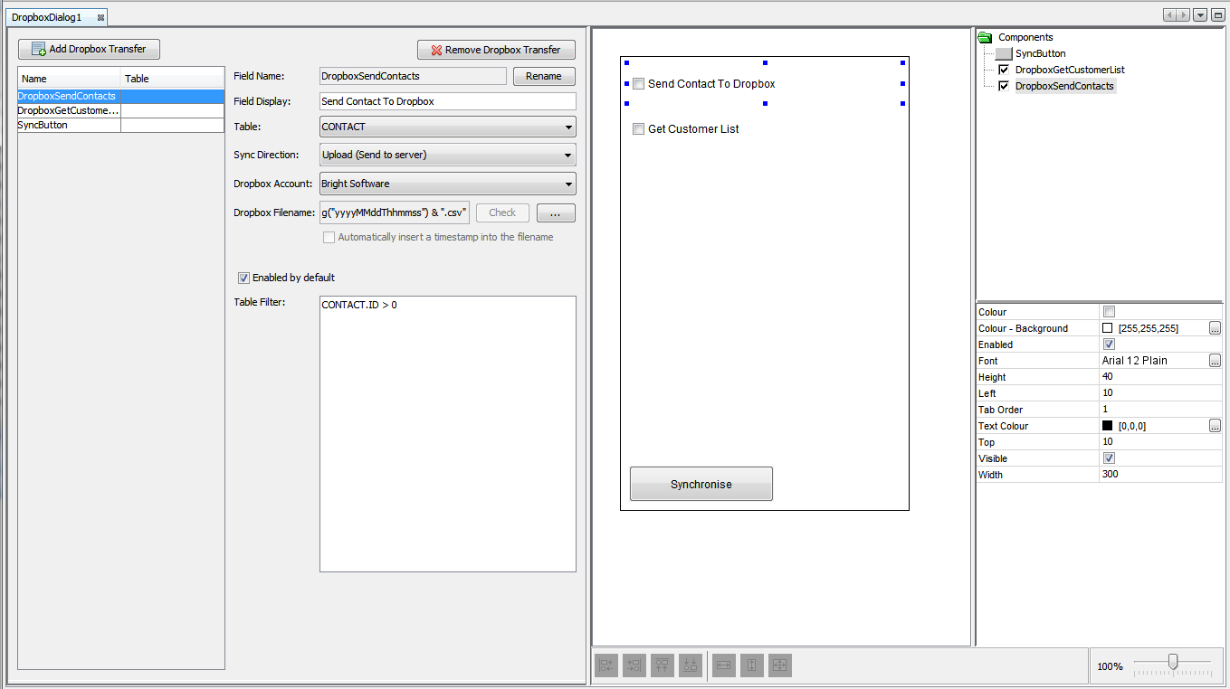the data set to be sent or downloaded. The Dropbox dialog editor allows