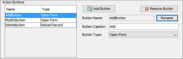 Open Form: Buttons of this type indicate the button will open another form within the application. The child form to be opened by the button can be selected through creating a form link from the application panel. The two buttons initially added for adding and modifying data in the data table will be set to this type.