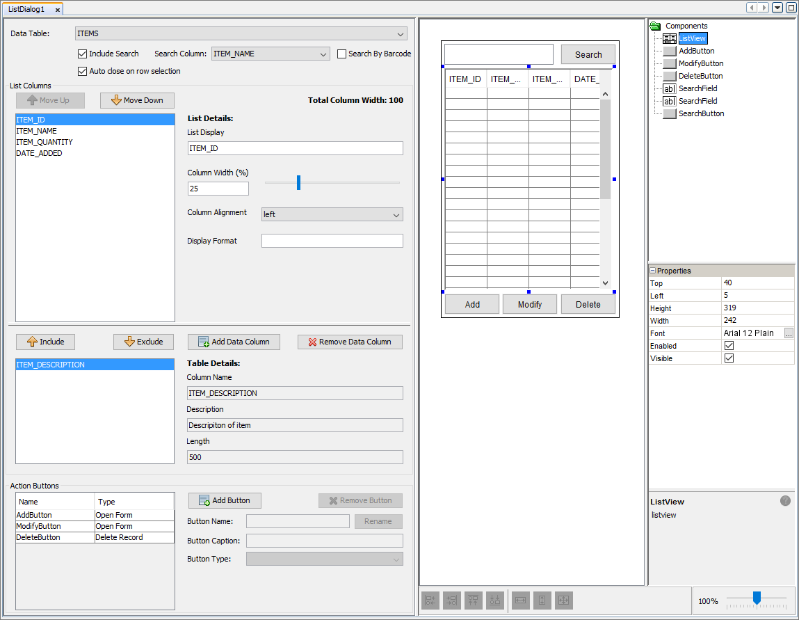 List dialogs provide a form that allows for data within a table to be displayed. A list dialog will contain a list view control that can be used to display the records within a table. When being opened, a list dialog can be opened with context to display all records or a subset of records in the assigned data table. The context for opening the list dialog can be set through form links. The list view control can also be edited to show only a subset of columns within the data table. Through this dialog, multiple buttons can be added with the purpose of changing the flow of the application in order to add or modify records within the data table. List dialogs also provide the ability to search through the records in the data tables and also be able to interact with the listview by assigning form links to single and double taps of records in the listview.
