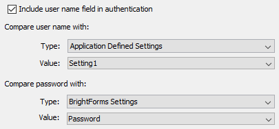 BrightForms Settings: The user name/password entered will be compared with the BrightForms user name/password configured in BrightForms' settings. They are the same user name and password used when synchronising the application to BrightServer. Once this type is set, the values available are 'User Name' and 'Password'.
