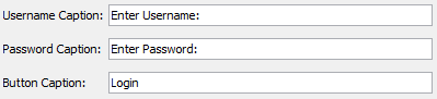 The login dialog window also allows you to change the captions that appear next to the edit controls 'UserField' and 'PasswordField'. These captions/labels are added to ensure the user knows which edit control to enter their credentials. As you type into these fields, the WYSIWYG window will reflect the changes made.