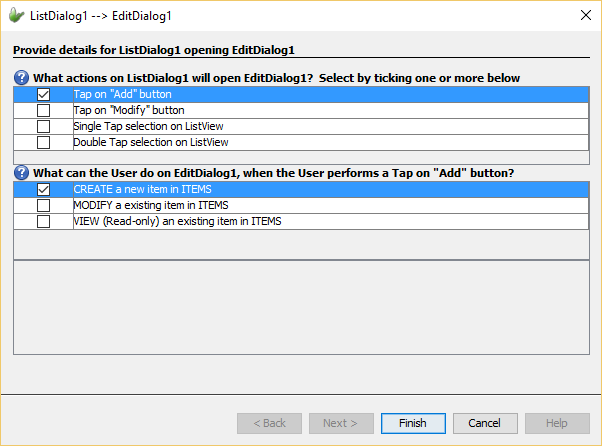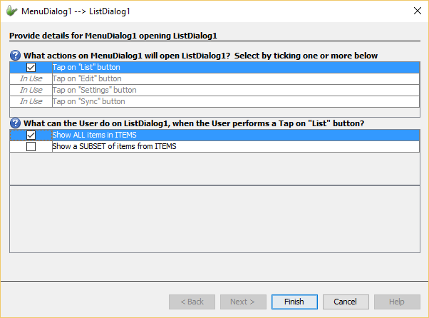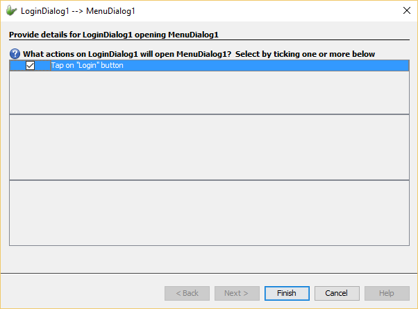 Once an action is been chosen and the 'Finish' button is pressed, it will update the connection with the selected action that will cause the flow of the application to change. From the form link above, LoginDialog1 will open the menu dialog 'MenuDialog1' when the 'Login' button is tapped.