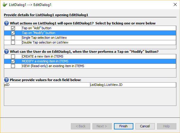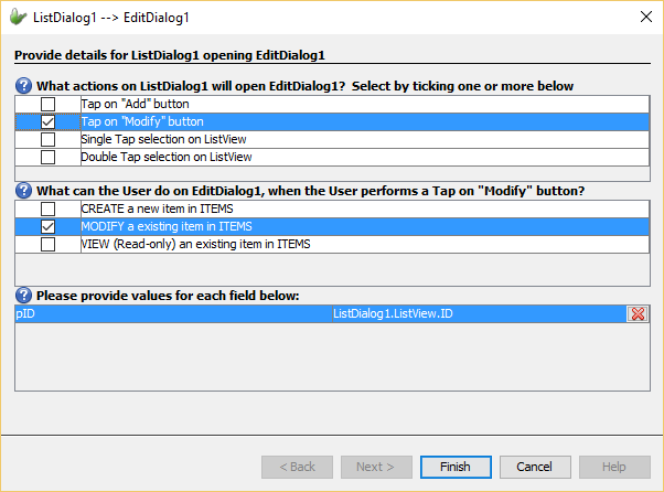 From the images above, ListDialog1 will have multiple actions to open EditDialog1. The first action is by tapping the 'Add' button in which the edit dialog will be opened to create a new item in the data table. While the second action to open EditDialog1 will be through tapping the 'Modify' button which will open the edit dialog to modify an existing item that satisfies the pID/unique record identifier value (i.e. open dialog to modify currently selected item).