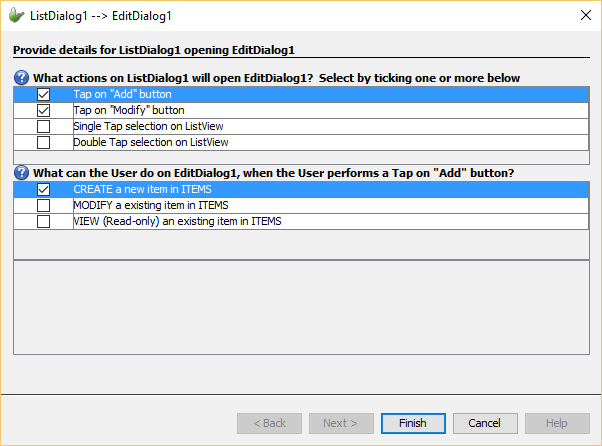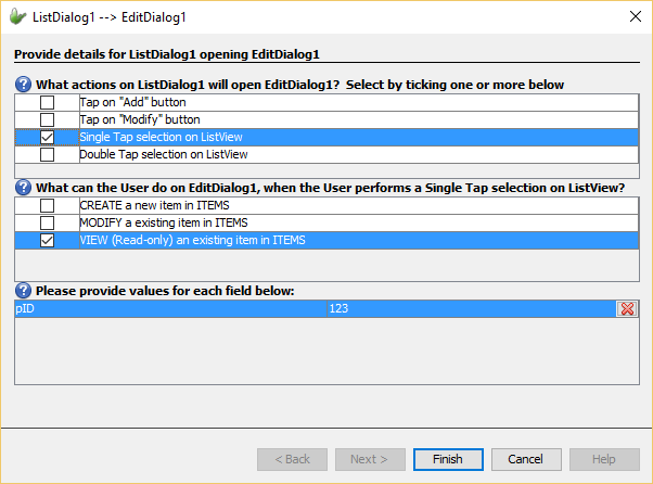 From the image above, 'ListDialog1' will open 'EditDialog1' when a single tap occurs on a selected item in the listview. The edit dialog will be opened to view an item in the data table where their unique record identifier is equal to '123'.