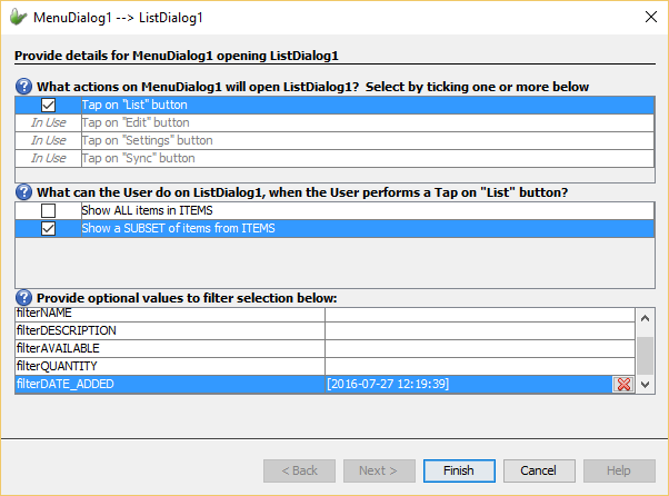Filter values will be used to query the data table to gather all the items that match the filter values and create the subset of items to be displayed in the listview. From the 1st image above, when the 'List' button is pressed from MenuDialog1, ListDialog1 will be opened to show a subset of items where each item has their DATE column equal to the 15th June 2016 12am (2016-06-15 00:00:00).