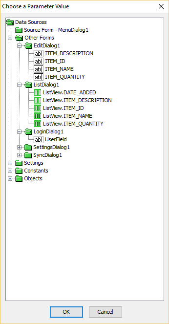 However if the edit dialog is to be opened for modifying an existing item in the table, even more information in required. Information is needed to indicate which record in the table will be modified and populate the fields in the edit dialog. The form link editor window will display all the values needed to be set to specify the item to be loaded usually stated through the unique record identifier of the data table. By pressing on the field, it will open the 'Choose a Parameter Value' window. In this window, the value to query the data table can be set. These values can be form values from the project, application settings, user defined constants or Object method values.