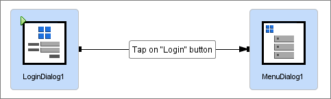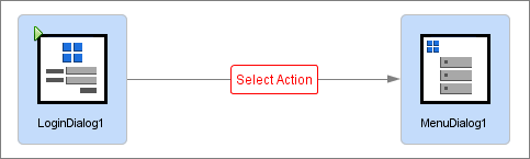 These connections represent the flow of the application by showing what form dialogs can be traversed. For example, a line from a login dialog to a menu dialog indicates that the login dialog will open the menu dialog. To perform this functionality (i.e. form opens another form) an action will need to be set. For each directional arrow at least one action must be specified to detail the action to be performed in the parent dialog for the connected child dialog to open.