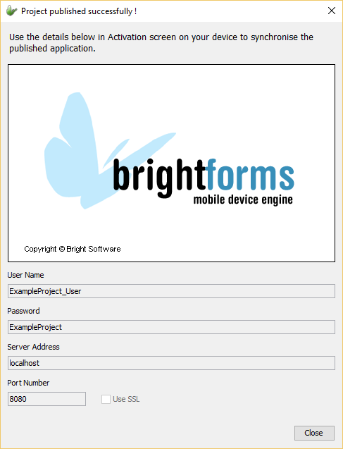Projects developed using the Business Application Designer can be easily published onto BrightServer instances. By connecting to these BrightServer instances with BrightForms, published applications can be downloaded and executed on mobile devices. BrightServer is a lightweight server side solution that can be used for publishing and distribution of the latest published mobile applications and business data on mobile devices. Deployment of application has become even simplified without the need to register users on the server side. Through the BXP Designer and BrightServer, user accounts and deployment of applications is bundled together through one simple button click.