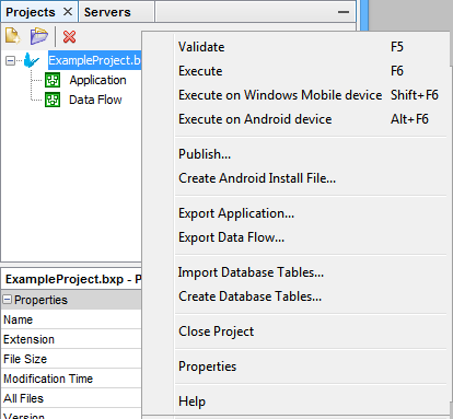 'Export Data Flow ...' : This option is similar to exporting the application logic to a BSP project by using the above option. This option allows the creation of a BEP project from the BXP project. The purpose is again to allow the advanced configuration, programming techniques and methods to implement features and functionality that may not be available through BXP projects. Note that the changed BEP projects cannot be imported back into the BXP project.