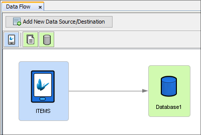 From the above data flow, records created in the client table 'ITEMS' on mobile devices will be sent to the 'Database1' database defined by the data accessor node. The records on the device will be sent when the device synchronises to the server via sync requests in the Sync Dialog.