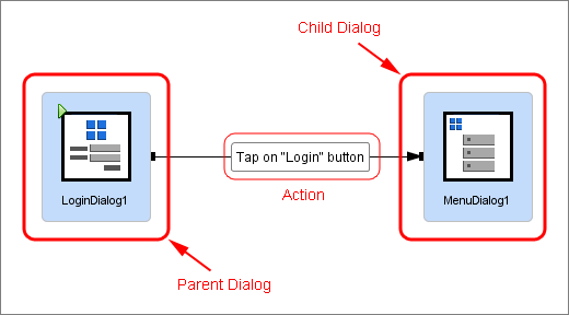 These dialogs can be connected through form links. These form links specify the flow of the application by showing the dialogs that can be opened from specific dialogs within the application. Form links may be created in the application panel by holding the 'Ctrl' button, then left-clicking and dragging the mouse between the parent and child dialogs. This will establish the form link between the dialogs, represented by a directional arrow showing the child dialog (node with arrowhead pointing towards it) that is to be opened by its parent dialog. The actions to be performed to open another dialog is also shown on the directional arrow. By double clicking on the middle rectangle box that appears on the arrow, the action in the parent dialog that will open the child dialog can be set.