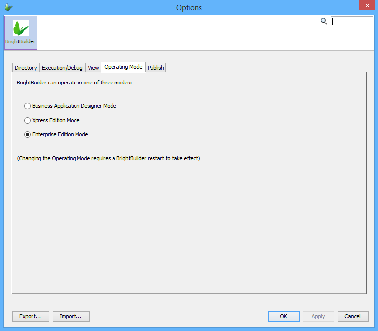BrightBuilder by default is configured to design and deploy to BrightServer Xpress Edition servers, as configured by the selection of 'Xpress Edition' in the Options panel. If the non-Xpress edition of BrightServer is used, to have BrightBuilder reflect the full functionality of this product, please locate this tab in the options, and select 'Enterprise Edition Mode'. For more information on the editions of BrightServer, please refer to the BrightServer > BrightServer Xpress Edition chapter of this document.