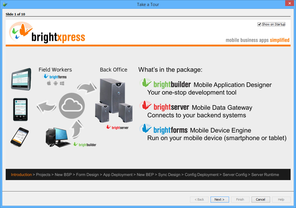 Upon opening BrightBuilder, the Take a Tour dialog will appear, showing a series of slides demonstrating how to get started with BrightBuilder and how it is used with the BrightXpress Mobility Suite. Tapping the Next/Previous buttons will navigate through the slides, while tapping Cancel or Finish on the last slide will close the dialog.