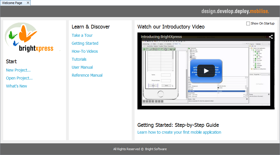 The Welcome Page will also appear, providing quick shortcuts to create and open new projects, and providing links to BrightBuilder and BrightXpress documentation for additional information to get started.