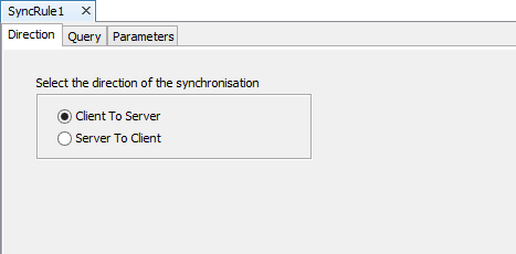 The Direction tab has two choices depending on which direction the data needs to be transmitted. Data can be synchronised from the client to the server or from the server to the client.