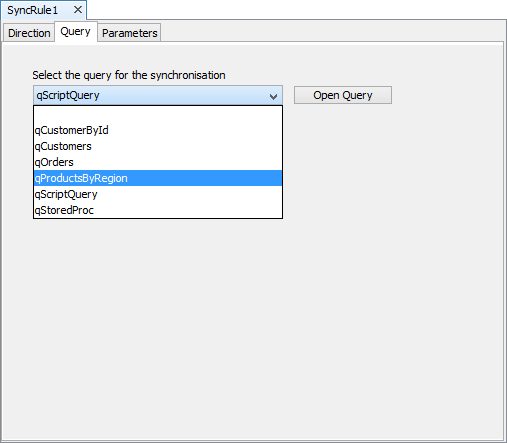 To link a query to a sync rule, go to the Query tab of a SyncRule and select the query from the Select query for the synchronisation drop-down list.