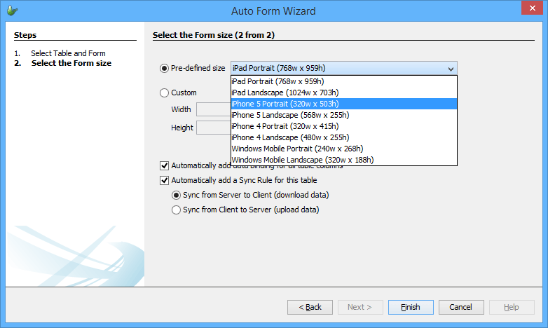 The first screen allows you to select the project and the table that will be used for the form. From the second screen, as shown below, it will allow you to select the size of the form and also the data binding properties for that form. There is also an option in this screen to create a sync-rule for this form.