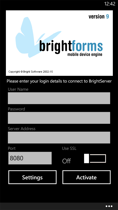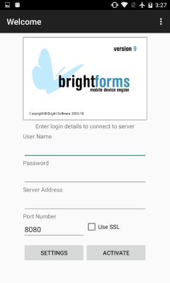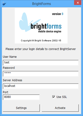 Setup BrightForms to connect to BrightServer by specifying the username, password and server address/port via the initial activation page or Help > Settings dialog.