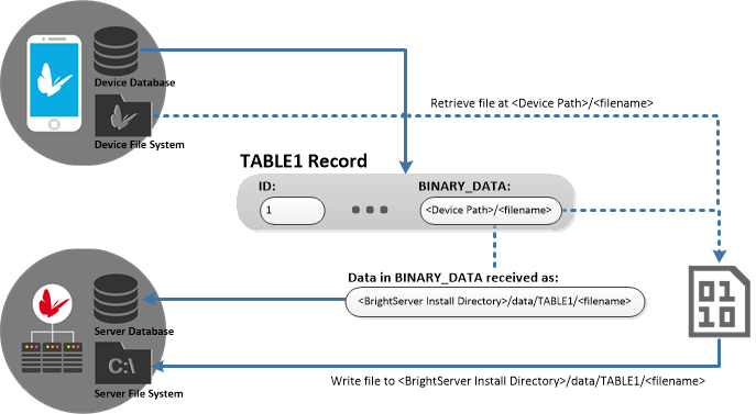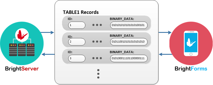 Binary data in records may be synchronised to and from BrightServer via the 'base64Binary' type for both BSP and BEP tables.