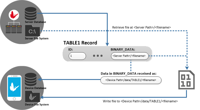 As the binary data is stored within the record, the sync engine will synchronise these records as-is to/from the server. While groups of these records will be sent based on the Data Size Limits of the server, at least one record must be sent each time using this feature. This may result in packet sizes larger than the maximum size being transmitted to and from the server if large amounts of data exist in the columns on either the device and server.