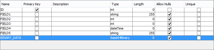 Data in this table column is stored as a String, which will specify a full file path to a file containing the binary data. Synchronising this path with the 'externalBlob' type, will chunk the file to be transmitted based on the Data Size Limits of the server. The packets of the file will then be sent to the device/server destination.