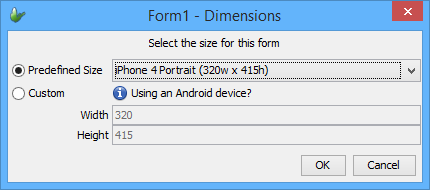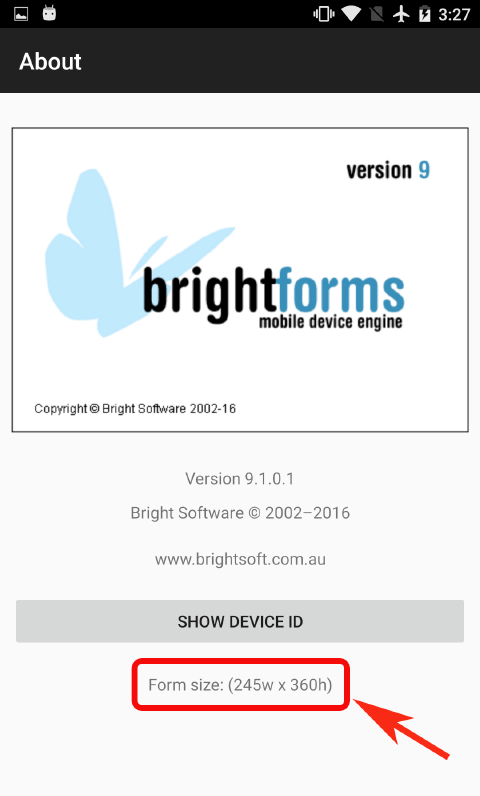 To determine the size forms must be for the device, open the BrightForms menu and view the 'About' screen. At the bottom of this screen, values for the device's screen height and width in logical BrightBuilder pixels will be displayed.