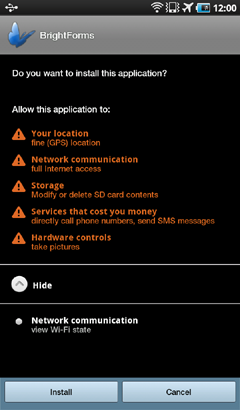 Tap on the result to enter BrightForms' application overview page. Tapping 'Install' will display the necessary permissions BrightForms needs to run on the device. Accepting these will install BrightForms to use on the device.