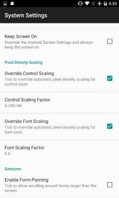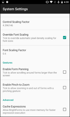 Projects are developed in BrightBuilder, and rendered on Android devices to match its design in the WYSIWYG editor. To ensure that this editor's contents are correctly rendered on Android devices, controls, fonts and images must be scaled by a factor determined by the device's pixels per inch. Scaling is automatically handled in BrightForms to give the optimal WYSIWYG transition between BrightBuilder and BrightForms, but these scaling values may be overridden via the Settings>System menu, under the heading "Pixel Density Scaling".