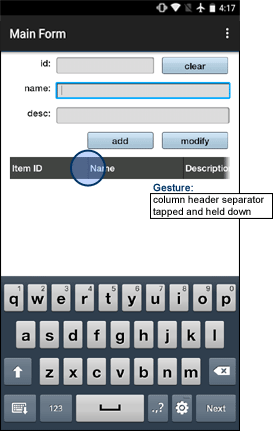 When the header is selected and held, the device will vibrate, signalling that the column widths may be adjusted. Once adjusted, release the tap from the screen, and the listview will save the new width changes for future sessions.