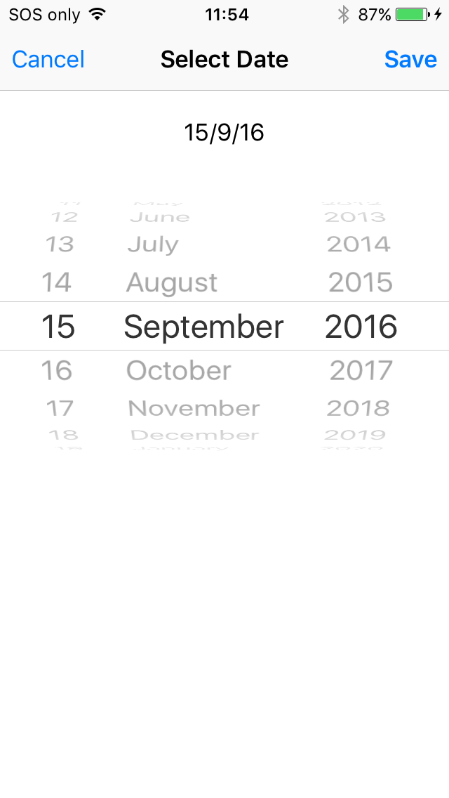 Similar to the combo box, the date time control allows the user to select a date via the iOS picker, with the current date highlighted in blue. Tapping on the top left 'Cancel' will discard any changes, while 'Save' will return to the form with the selected value.