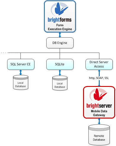 Data in BrightForms utilises the industry standard SQLite for local storage, but also supports various databases including MS Access over ADO in previous versions. BrightForms uses industry standard SOAP to communicate with the Mobile Data Gateway over http for data synchronisation and application distribution. It also supports data encryption and security using SSL. And supports compression for optimisation.