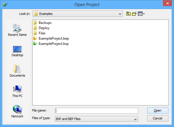 Select the directory where the project is located. Note that both BSP and BEP projects will be accessible from this point; take note of the file extensions.