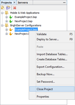 Closing a project will remove the project name from the list on the Projects Window and will also close all project elements that are open in the Editor Window. Furthermore, if the project is currently running as an embedded instance, BrightBuilder will terminate the BrightServer instance upon closing the project file.