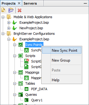 A BrightServer project is saved as a .bep file and contain the necessary configuration design data to execute BrightServer. These projects define the tables expected and data paths of the device's captured data when synchronised to BrightServer - such as specifying them to be read/written to a back-end database or other data accessor. The project definition may also provide transformations, complex manipulations or data retrieval through external libraries via scripting definitions in the project.