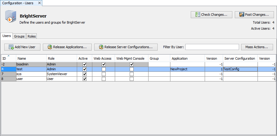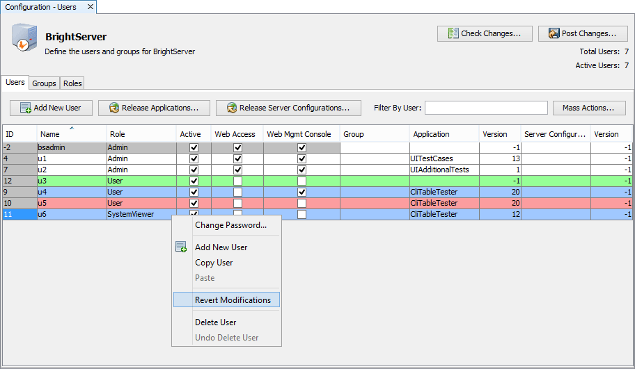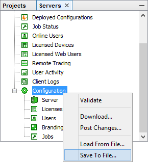 After editing, the runtime configuration may be uploaded to the server or saved to file by clicking the corresponding action from the Configuration node context menu. Alternatively, changes may be uploaded using the 'Post Changes ...' button in the user, server or licenses workspaces.