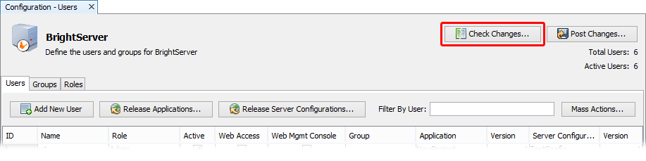 When uploading configuration changes to the BrightServer server instance, a preview dialog will show the changes to be made for user confirmation. Configuration changes may also be verified by using Validate context menu option to prevent incorrect configuration data from being uploaded to server.