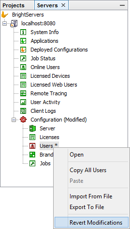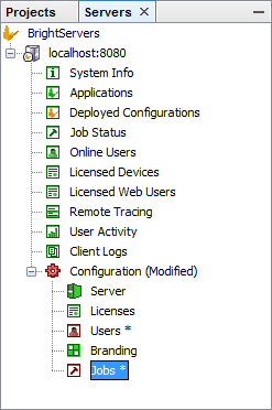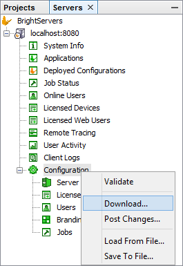 The Configuration node of a BrightServer instance allows you to connect to a running server, download the runtime configuration, make modifications and upload the changes back to the server.
