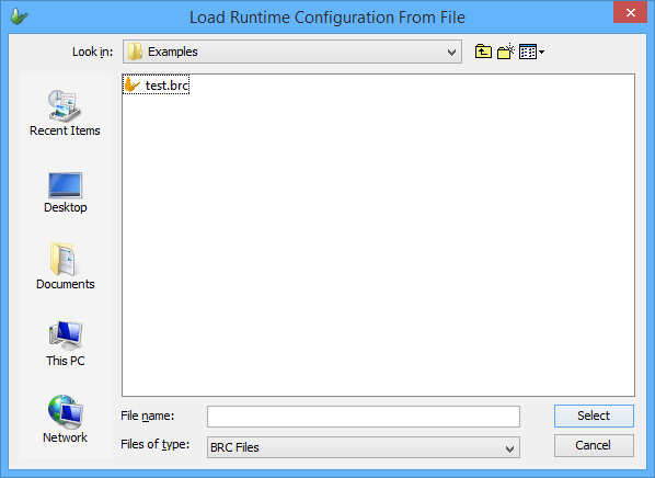 To load a runtime configuration from file right-click on the Configuration node and click Load From File.... This will load the runtime values into the Server, Licenses and Users panels.