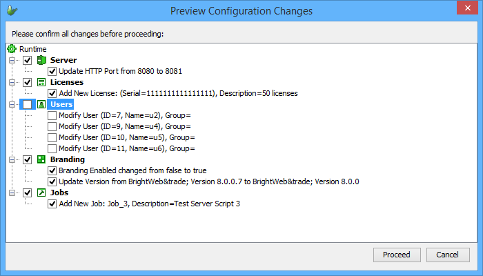 Each of the nodes and individual items in the preview configuration changes window may be toggled, such that proceeding will not commit the changes to the server. The changes will remain edited for the server, once this dialog closes.