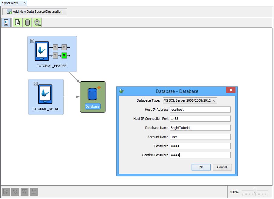 Configure DB in Sync Panel. Create the DB on the server, and use the 'Create Database Tables ...' option to create the TUTORIAL_HEADER and TUTORIAL_DETAIL records on this database.