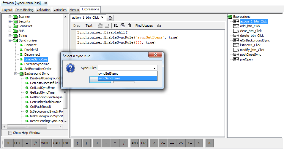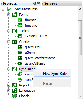 Once defined, the sync rules in the project can be found in the data source tree, and may be used in expressions with Synchroniser object. Executing the rule will then send the records resulting from the query to the server.